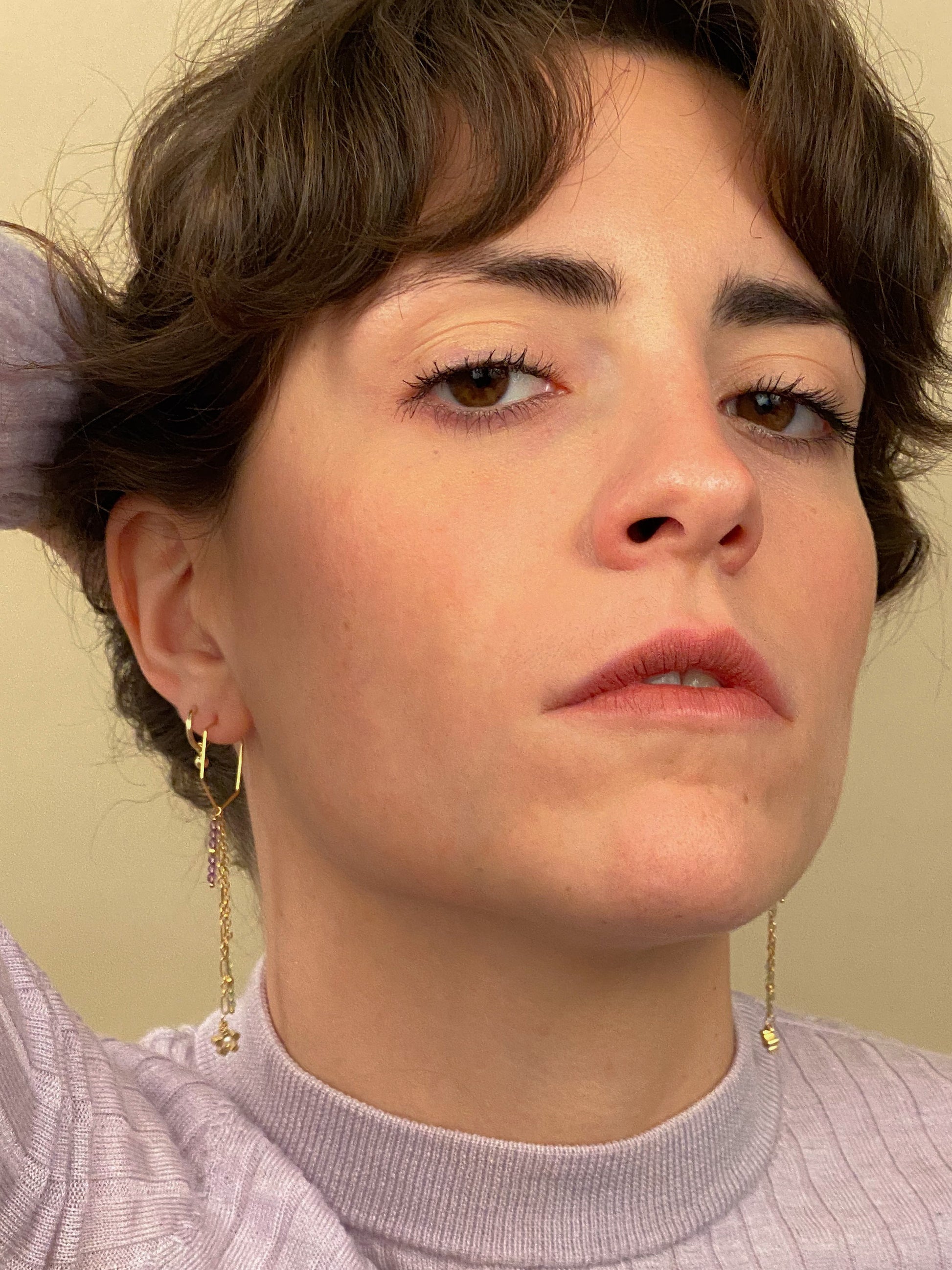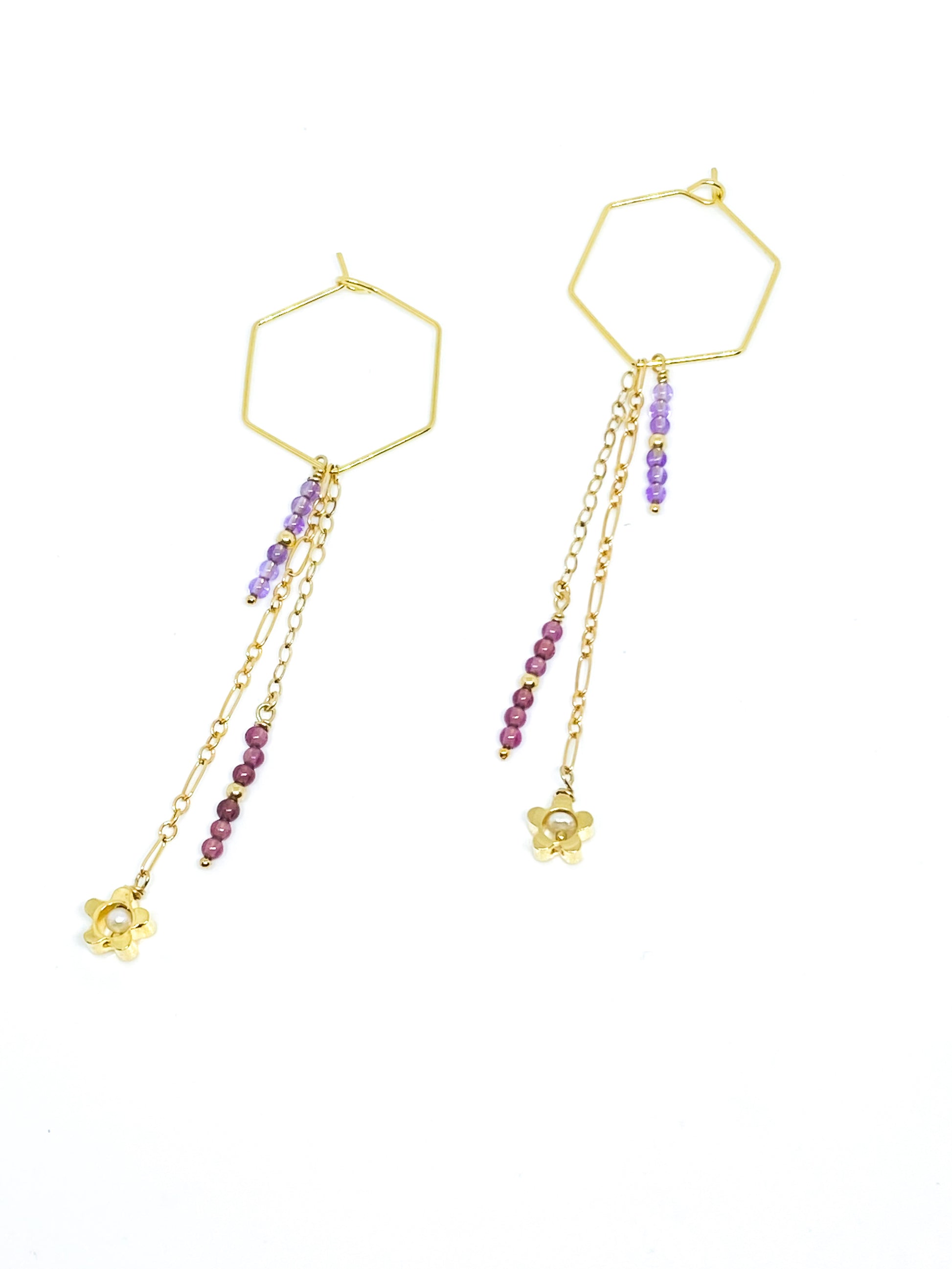 24k 3 microns Gold plated over brass Hoops with Amethyst, garnet, mother of pearl and gold filled bead. Gold plated over brass flowers..